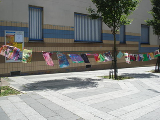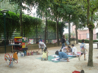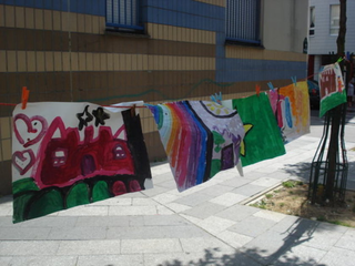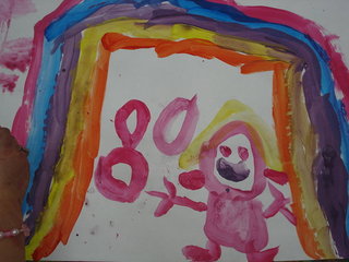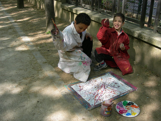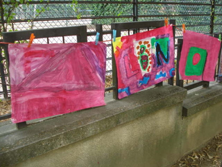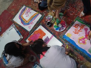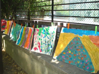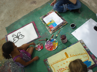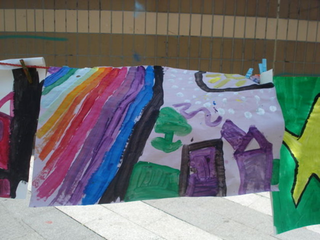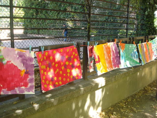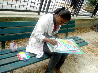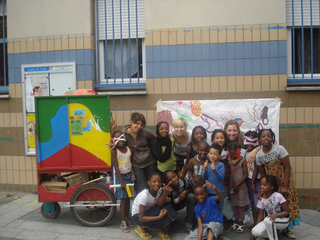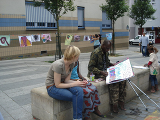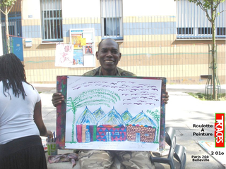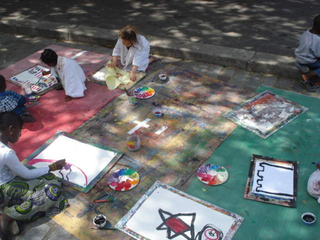 raison est simple, ils sont au travail. Le temps des vacances a changé, les vacances hors de la maison sont plus courtes, les familles passent plus de temps dans leur propre maison. Les familles reçoivent aussi de la visite de parents vivant à l'étranger. Comme cette grand mère s'adressant en anglais avec son petit fils vivant à Londres. Elle est elle même en vacances chez ses enfants. Elle vit en Guinée Conakry. Cette grand mère n'est pas une exception. Déjà par le passé, une jeune africaine vivant à Cologne est revenu nous voir avec ses cousins qui vivent et vont à l'école dans le quartier. Cette année, la carte du monde aura été presque complète. Le dernier jour, une averse perturbe l'atelier. Pas assez pour faire fuir les enfants. Pour finir cette saison riche en rencontre, nous peindront finalement une fresque que nous laissons sur le mur de l'école. Photos final, embrassade et pincement au coeur. C'est partie remise l'an prochain, c'est promis. Grand